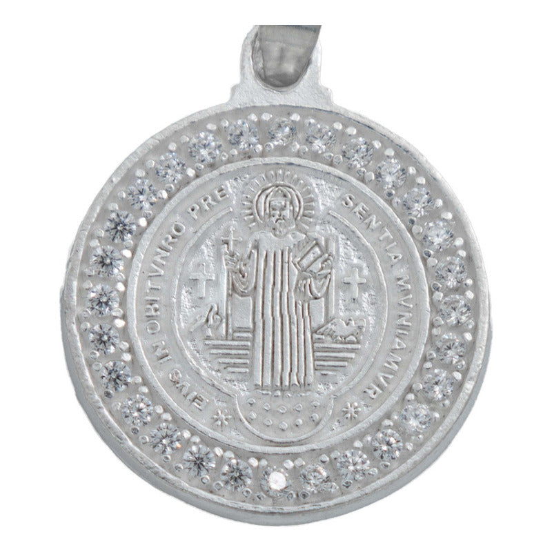 Dije Medalla San Benito Oración Zirconias Plata 925 1.6 Cm Blanco