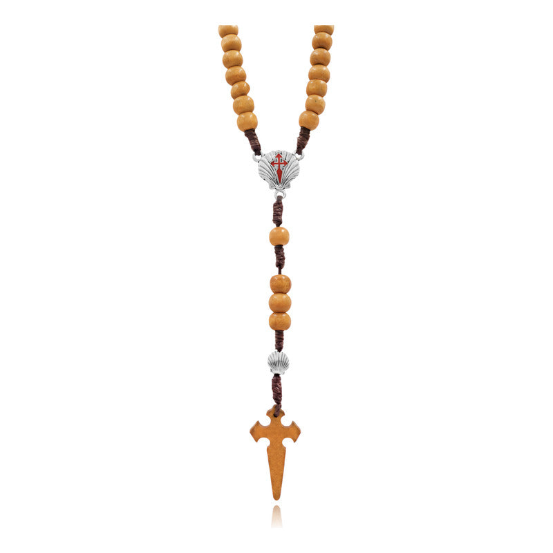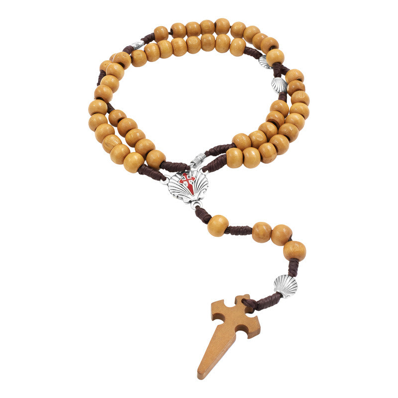 Rosario Madera Cruz Catolica Camino De Santigo Conchas Metal Marrón Claro